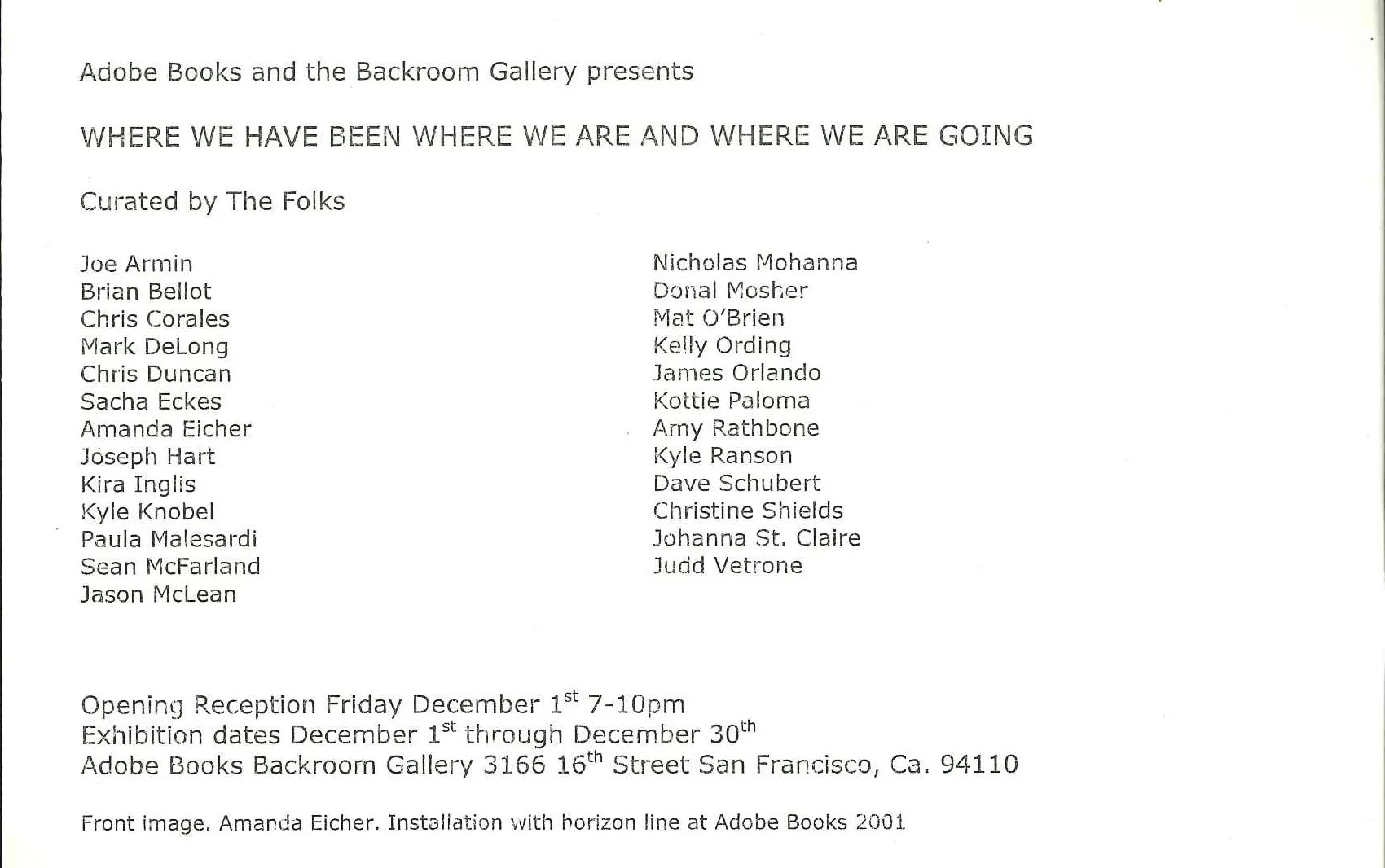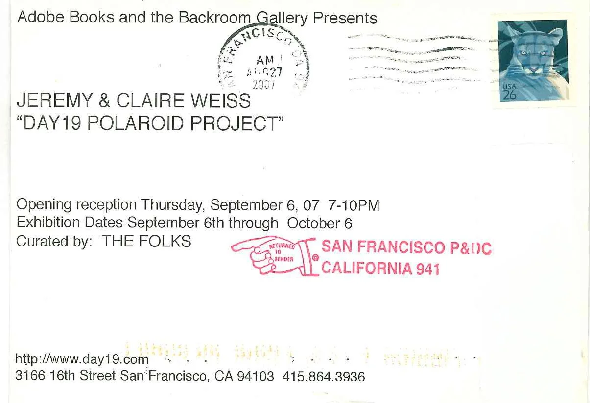 The Adobe Bookshop Backroom Gallery lived and died in San Francisco. From 2007-2009, Rehill curated the space with Dan Johnson Lake, Maggie Otero, and Brian Nuda Rosch under the moniker THE FOLKS (inspired by crime fiction novelist and sometimes-stand-up comedian Patrick Hoffman). Postcards were mailed out for every show, labeled and stamped by then-roommates Dan Johnson Lake and Rehill. These are a few of those that remain. Thanks to Dan Johnson Lake for finding these and mailing them to NYC for a loan.